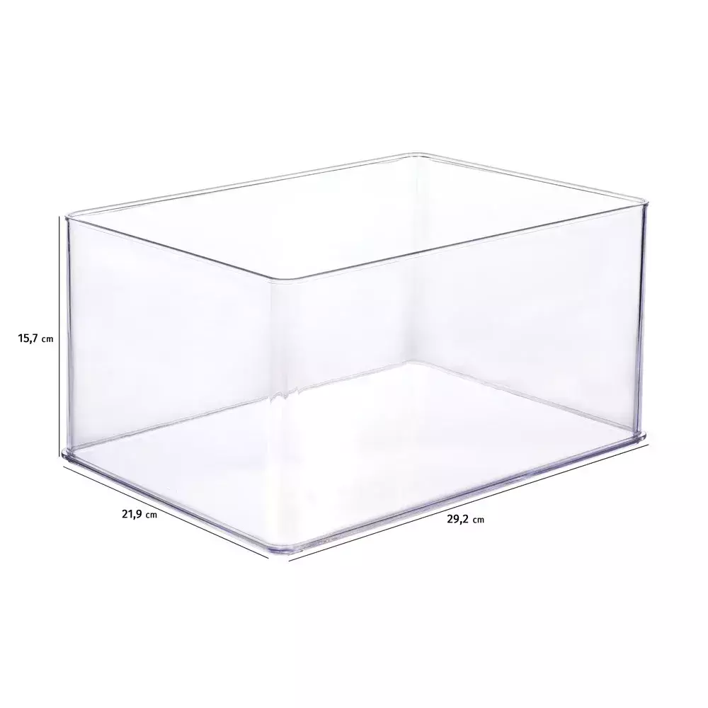 Organizador retangular em caixa de poliestireno transparente (Plasutil). Dimensões: 29,2 cm (comprimento) x 21,9 cm (largura) x 15,7 cm (altura). Material transparente, ideal para organização de itens na bancada, bancada de trabalho ou prateleiras, permitindo visibilidade total do conteúdo.